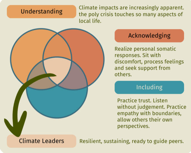 | Climate impacts are increasingly apparent. The poly crisis touches so many aspects of local life, to cultures with myriad effects. | Realize personal somatic responses. Sit with discomfort, process feelings, and seek support from others. | Practice trust. Listen without judgment. Practice empathy with boundaries, allow others their own perspectives. |